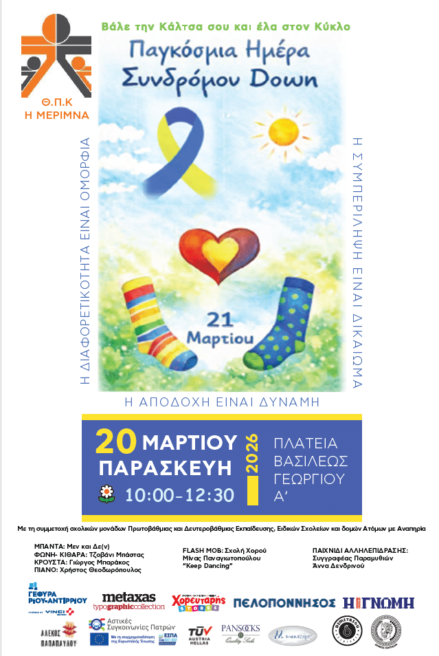 Το Θ.Π.Κ. «Η ΜΕΡΙΜΝΑ» διοργανώνει εκδήλωση ευαισθητοποίησης με αφορμή την Παγκόσμια Ημέρα Συνδρόμου Down, η οποία τιμάται στις 21 Μαρτίου 2026, με σύνθημα «Είμαστε διαφορετικοί και ίσοι».