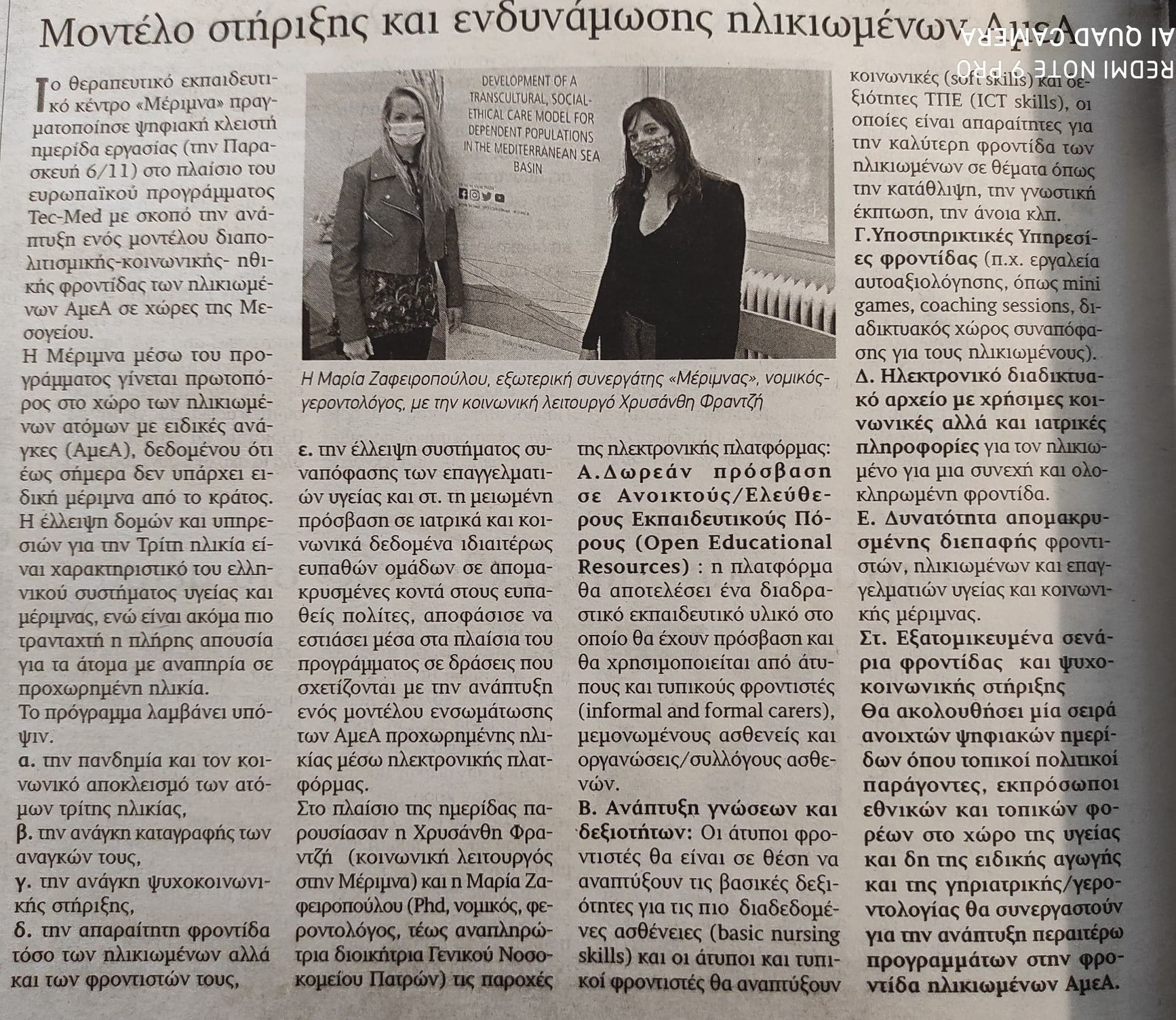 Το πρώτο μέρος εστίασε στην παρουσίαση του μοντέλου, στις κοινές ανάγκες των Ηλικιωμένων στις χώρες – συμμετέχοντες καθώς και στις καινοτομίες που ισχυρίζεται ότι καλύπτει το έργο TECMED.