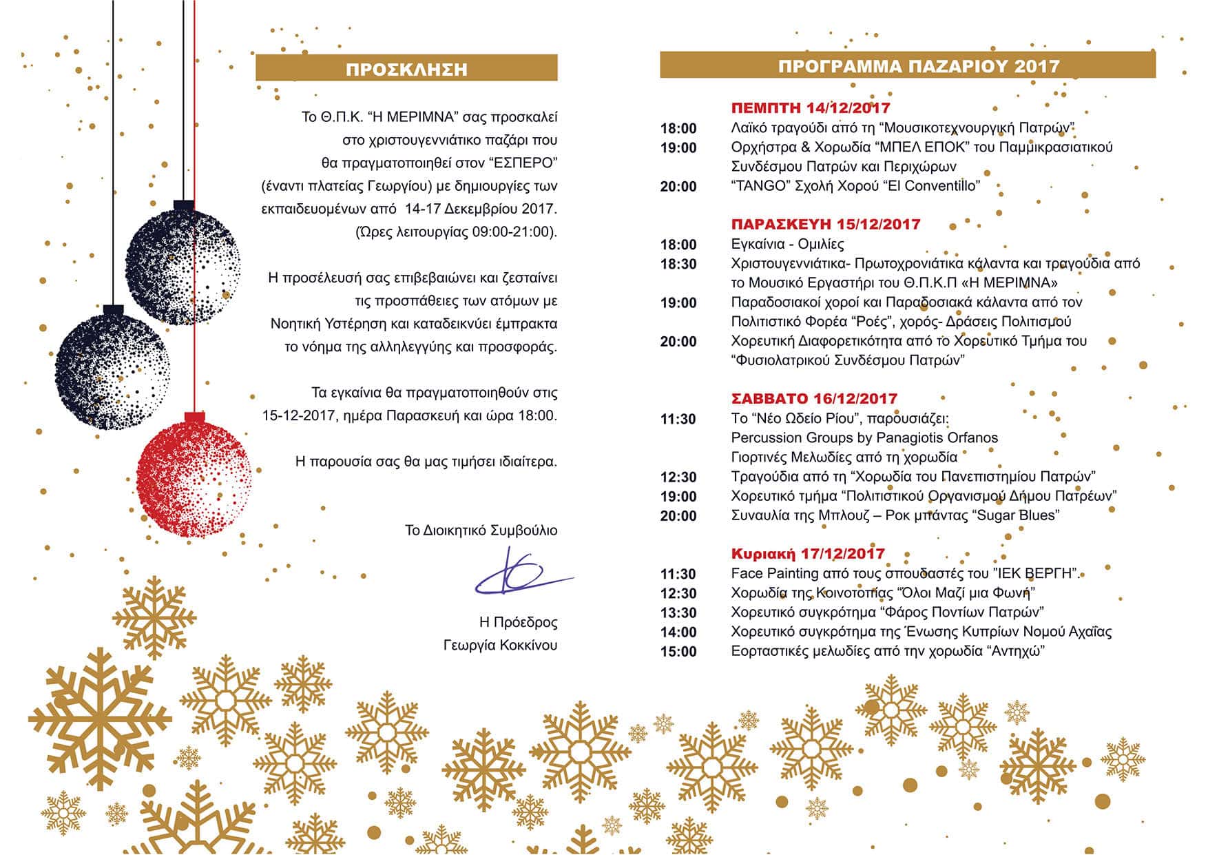 12 Δεκ Πρόσκληση & Πρόγραμμα Χριστουγεννιάτικου Παζαριού 2017 Posted at 07:02h in ΓΡΑΦΕΙΟ ΤΥΠΟΥ, ΕΚΔΗΛΩΣΕΙΣ by mer_pat_edit